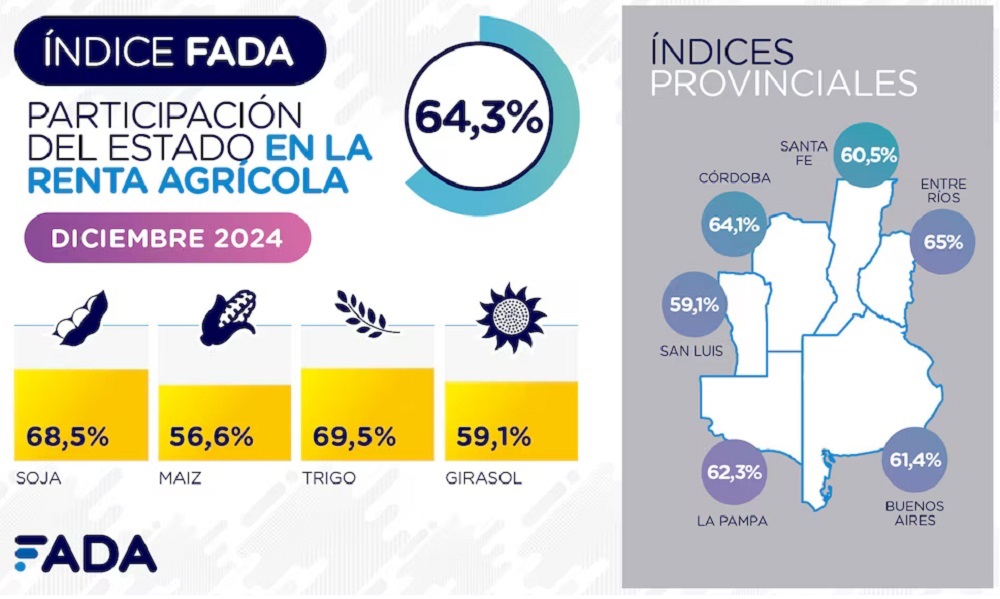 El Estado se queda con $64,30 de cada $100 de renta agrícola, según un informe de la Fundación Agropecuaria para el Desarrollo de Argentina (FADA).Este índice, que ha aumentado 2,8 puntos respecto a la medición de septiembre, refleja una creciente presión fiscal sobre los productores, impulsada principalmente por la caída de los precios de los productos agrícolas y el menor impacto del dólar exportador, indica el estudio. Y agrega que, en comparación con diciembre de 2023, este porcentaje es 5,4 puntos más alto.