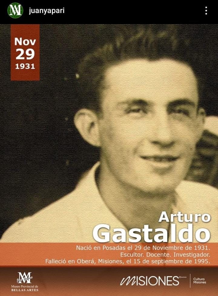El escultor Arturo Luis Gastaldo (1931-1995) nació en Posadas, entre la Bajada Vieja y el Cerro Pelón, donde se comenzó a interesar por modelar la arcilla que extraía de las barrancas. Estudió en la Escuela Superior de Bellas Artes de La Plata, donde recibió una formación académica bastante disciplinada de profesores que viajaban a formarse en Europa. De regreso, se estableció en Oberá, donde comenzó a dar forma a una pequeña institución dedicada a las bellas artes. Aquí formó su familia con la pintora Elba Gsell con quien tuvo cuatro hijos: Félix, Ebal, Cristina y Florencia.