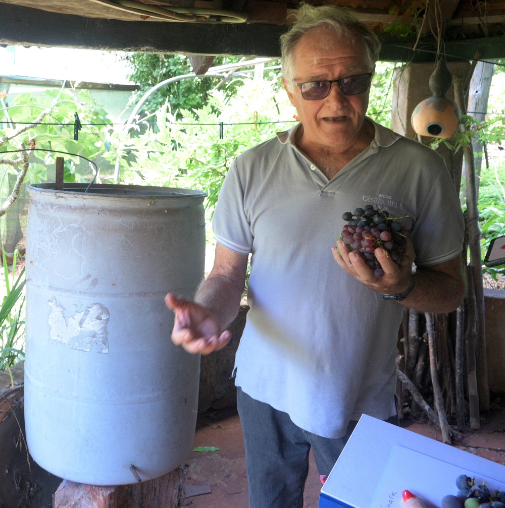 Comenzó con la plantación en el año 2002 en un cuarto de hectárea y tardó unos cinco años para comenzar a recolectar los primeros racimos. “En este predio tenía once variedades, entre ellas, venus, Niágara, moscatel, Isabel, chinche, chardonnay, tintorera y uva banana, que en su momento traje desde Brasil, pero no resistió. Ahora estoy cuidando una nueva, de color blanco, y estoy en tratativas de conseguir una de color negro”, comentó el hombre, que se limita a elaborar el vino sin pesticidas ni conservantes, “tal como lo hacía papá”.