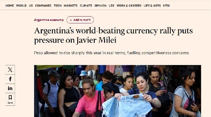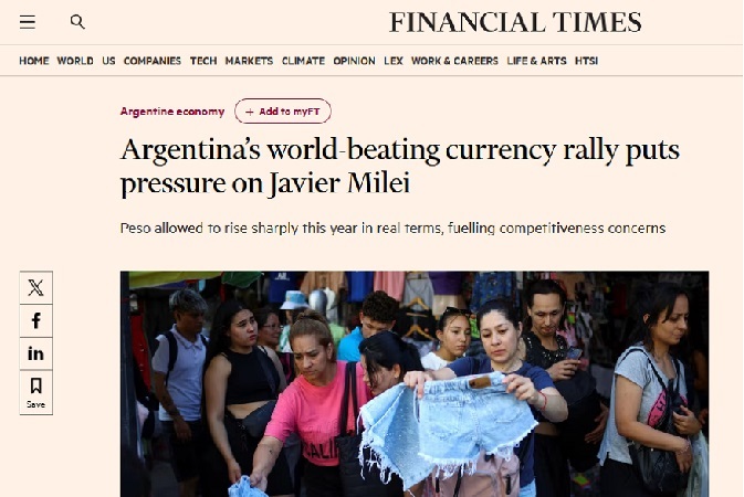 El diario económico Financial Times volvió a referirse a la situación económica de la Argentina y publicó un artículo en el que analiza que “la fuerte alza del peso en términos reales, lo que alimenta las preocupaciones sobre la competitividad” y destaca que “la recuperación de la moneda argentina, que supera a la del resto del mundo, presiona los planes de Javier Milei”.