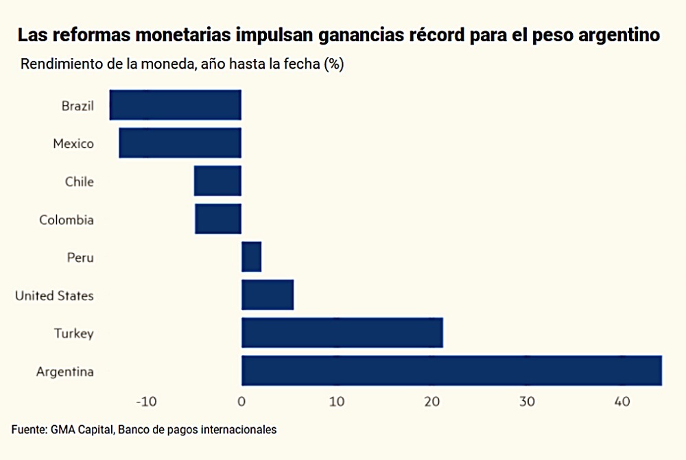 “Argentina siempre ha buscado un tipo de cambio más débil para resolver nuestros problemas de competitividad, y ha generado muchas crisis en nuestra historia”, dijo al FT Nery Persichini, jefe de investigación de GMA Capital. “Ahora los tiempos están cambiando”.