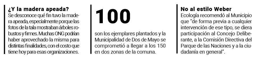 Al momento de justificar el accionar comunal, se indicó que “se pudo constatar la extracción de árboles, de los cuales ninguna de las especies extraídas son Monumentos Naturales Provinciales”; “… que el predio conocido como Parque de las Naciones se encuentra dentro del espacio urbano del municipio y no es una reserva, por lo que no se encuentra dentro del Sistema de Áreas Naturales Protegidas”; “… por consiguiente, el manejo de dicho espacio verde urbano, es de jurisdicción de la comuna”, lo que pareció indicar que Weber podía hacer lo que quisiera. Sin embargo, en párrafo posterior, se admitió que “cuando un municipio tiene previsto hacer una intervención sobre masa boscosa o cualquier acción que pudiera producir un impacto en el ambiente, tiene la responsabilidad de comunicar a Ecología el plan de acción, a fin de que se haga un abordaje conjunto”. Lo que no ocurrió pero no importó.