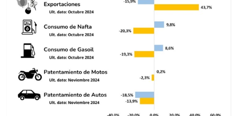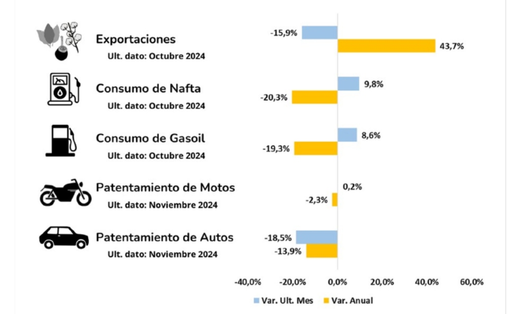 El consumo de nafta y gasoil en la región del NEA, aumentaron en promedio un 9,8% y 8,6% respectivamente en el mes de octubre respecto al mes anterior (último dato disponible). Por otro lado, los patentamientos de autos 0km cayeron un 18,5% mientras que los patentamientos de motos 0km creció un 0,2% en noviembre.