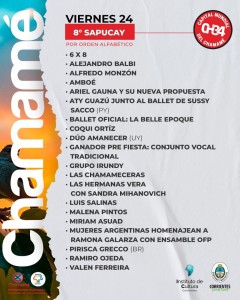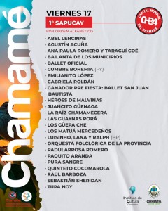 Una celebración chamamecera que ya confirmó su cartelera artística con la participación de importantes músicos, bailarines y cantantes de la región, entre ellos los misioneros: Fabián Meza, Che Rogá, Chango Spasiuk, Los Núñez, María Ofelia y Los Hermanos Britez, entre otros.