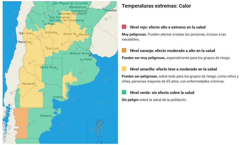 Por ahora, las provincias bajo alerta amarilla incluyen Neuquén, Río Negro, La Pampa, Buenos Aires, San Luis, San Juan, La Rioja, Entre Ríos, Santiago del Estero, Mendoza, Córdoba y Santa Fe. Por su parte, una sección de Chubut está bajo alerta naranja.