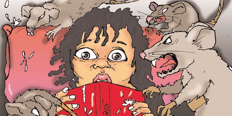 La mujer tendida en el suelo, casi sin fuerzas, trataba de quitarse de encima a aquellos roedores que estaban mordiéndola y rasguñándola sin compasión. Casi sin esperanza, se dejó caer sobre la cama, junto al libro que estaba leyendo.