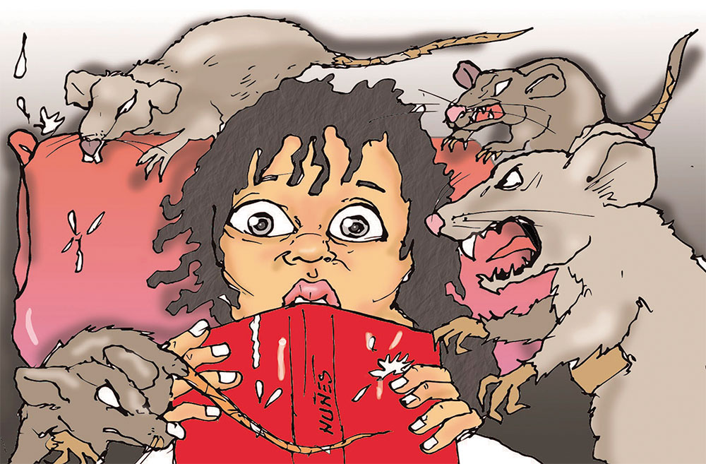 La mujer tendida en el suelo, casi sin fuerzas, trataba de quitarse de encima a aquellos roedores que estaban mordiéndola y rasguñándola sin compasión. Casi sin esperanza, se dejó caer sobre la cama, junto al libro que estaba leyendo.