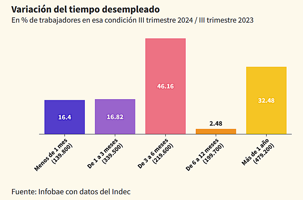 El tiempo inactivo se extendió en el año en un promedio de una semana, a 268 días, desagregado en aumentos en 20 días para el segmento de menos de un mes (140 mil trabajadores); 49 días en el de 1 a 3 meses en esa condición (340 mil), 69 días a los que están entre 3 a 6 meses (220 mil); 5 días al de 6 a 12 meses (200 mil trabajadores); y en 118 días el tramo de desocupados con más de un año de búsqueda (479 mil personas).