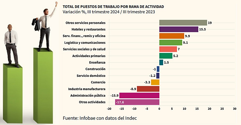 Entre las generadoras de empleos netos entre el tercer trimestre de 2023 e igual período de 2024 sobresalieron la rama de los servicios financieros, de alquiler y empresariales con 215.750 personas (9,9%); servicios comunitarios, sociales y personales diversos 214.600 (19%); hoteles y restaurantes 143.200 (15,5%); transporte, almacenamiento y comunicaciones 134.800 (9,1%); servicios sociales y de salud 91.300 (7%); enseñanza 26.200 (1,5%); y actividades primarias 11.400 (5,2%).
