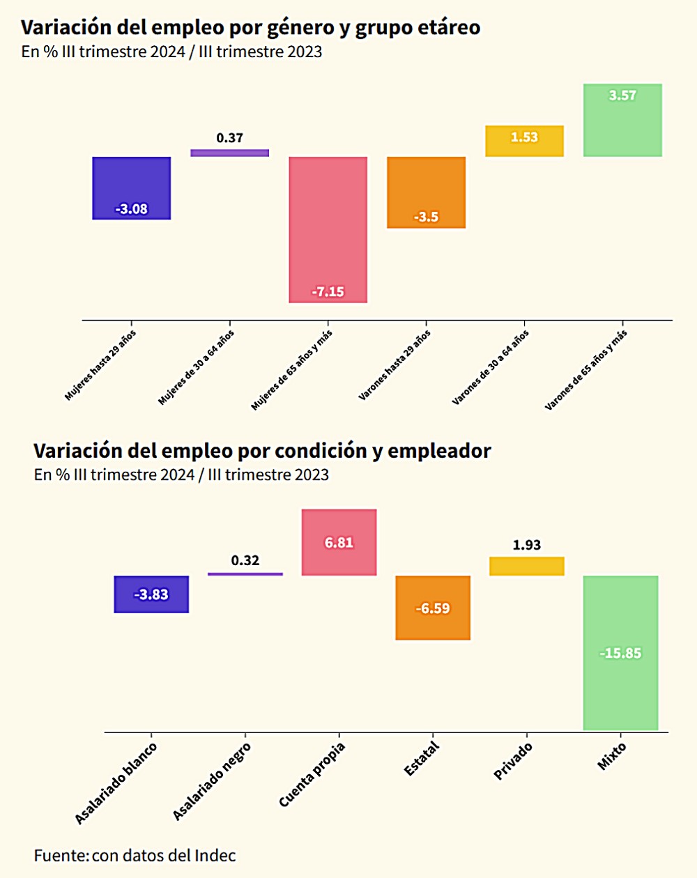 De los datos que surge de la última EPH que midió una caída de la tasa de empleo de 45,47% de la población en 31 aglomerados urbanos en el tercer trimestre de 2023 a 45% un año después, también se desprende que se movió de manera dispar por tramos etáreos de las mujeres y de los varones.