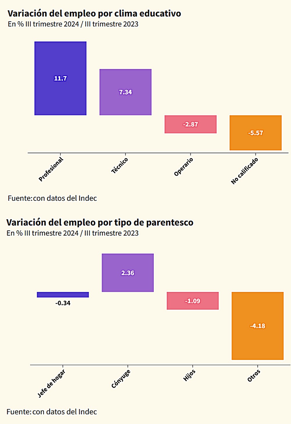 Según el clima educativo, entre el tercer trimestre de 2023 e igual tramo de 2024 el INDEC detectó disminución de puestos en los tramos con primaria incompleta 26.700; primaria completa 121.400; secundaria incompleta 97.300, superior y universitaria incompleta 171.500; y en los carentes de instrucción en 13.300. Por el contrario, aumentó en la franja con capacitación superior y universitaria completa en 300.800 puestos.
