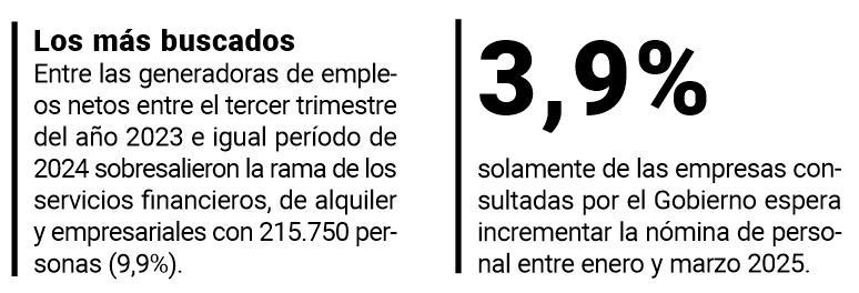 - El último dato oficial del empleo, correspondiente al tercer trimestre de 2024, arrojó una contracción neta de 13.400 puestos (0,06%) en comparación con igual período del año previo.