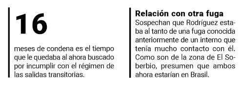 Finalmente, desde el tribunal autorizaron que siguiera con las salidas transitorias. En la misma cárcel, hubo dos fugas anteriores en los últimos tres meses, de las cuales tampoco hubo novedades de recaptura. Uno de esos internos, estaba en el mismo pabellón que Rodríguez y también sería oriundo de El Soberbio, pero ambos tendrían la mayoría de sus familiares en Brasil por lo que no se descarta que hayan cruzado clandestinamente el país vecino.