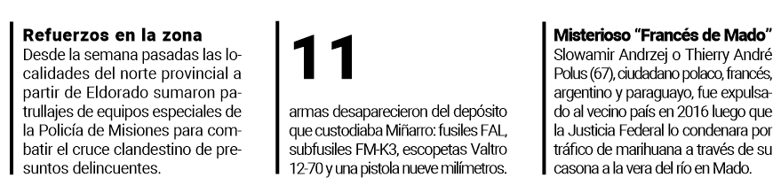 Si bien los datos son preliminares y aún no judicializados, al contexto de lo sucedido hay que sumar que las dos víctimas del golpe son empleados de una empresa de transporte de encomienda y logística argentina y, de acuerdo a las descripciones que habrían aportado a los investigadores policiales (Unidad Regional III Eldorado), las armas que blandieron los ciudadanos paraguayos coincidirían con los fusiles, subfusiles y escopetas que fueron robadas del destacamento de Infantería lindante al Aeroclub Eldorado entre la noche del 29 y 30 de diciembre pasado y que le costó la vida al suboficial que custodiaba el predio, Leonardo Mauricio Miñarro (33), atacado a balazos.