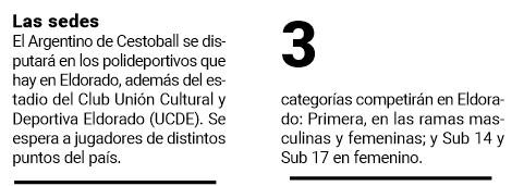La Confederación Argentina de Cestoball oficializó esta semana a Eldorado como sede del Campeonato Argentino de la disciplina, en sus divisiones Primera Femenino y Masculino, Sub 14 y Sub 17 Femenino, para el próximo julio.