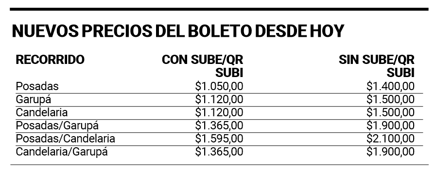 En la capital misionera, el boleto urbano quedará con el incremento en $1.050 con SUBE o QR y $1.400 sin ellas. En Garupá y Candelaria se elevará a $1.120 con SUBE o QR y $1.500 sin estos.