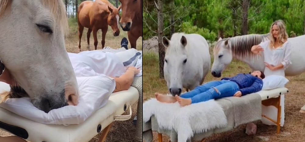 Es realmente fascinante ver el trabajo que realizan con cada persona. Mientras Candice maneja la energía con sus manos, los caballos eligen dónde posarse para la sanación.