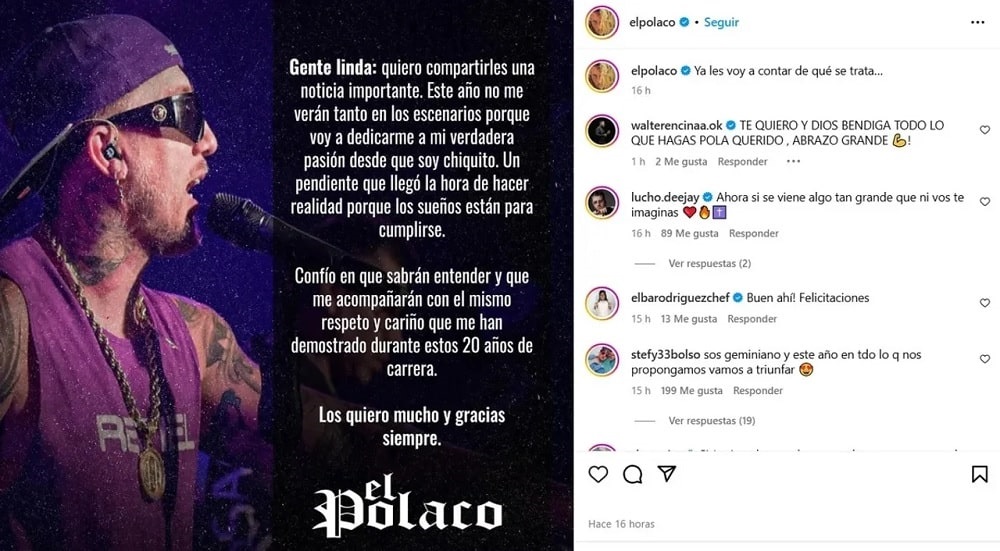 Ezequiel Cwirkaluk, más conocido como “El Polaco”, publicó un mensaje en sus redes sociales para anunciar que se alejará por un tiempo de los escenarios. “Ya les voy a contar de qué se trata…”, aseguró un tanto misterioso, informó la Agencia NA.