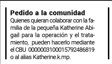 Contó que Katherine está conectada a un respirador y que los profesionales intentaron dos veces quitárselo pero no pudieron “porque no podía respirar solita”. Esta situación hizo que se le hicieran más estudios y ahí salió que tenía una bacteria intrahospitalaria .