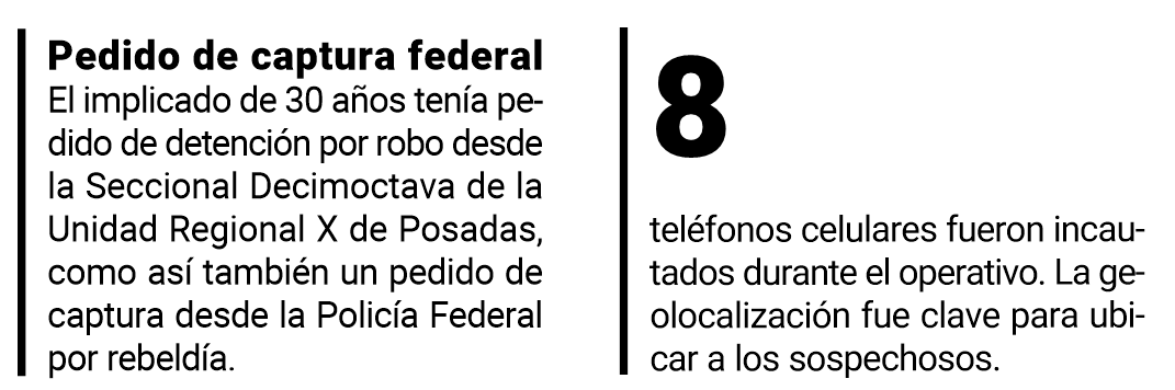 Se supo que ambos intentaron evadir a los uniformados, sin embargo fue en vano, ya que la propiedad estaba rodeada. En el lugar se incautaron ocho teléfonos celulares, dos Iphone (8 y 11), tres Samsung, un Poco, un LG y un Motorola, además de dos netbook. Colaboró en el operativo Investigaciones Itaembé Guazú y de la Dirección Guardia Infantería.