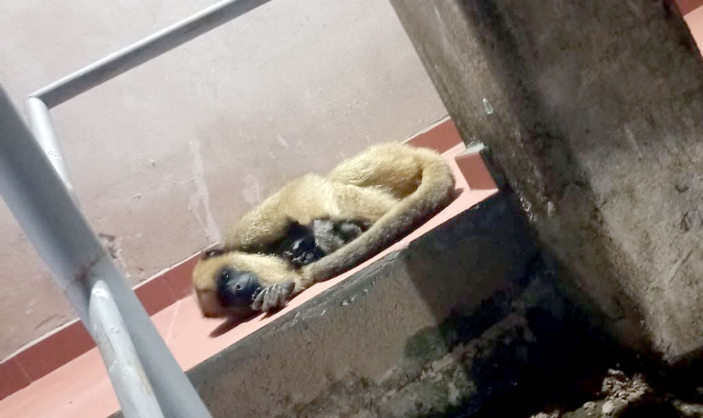 En la madrugada de este sábado, personal policial de la Dirección de Defensa del Medio Ambiente, junto con agentes de la Comisaría 14ª, rescataron a un mono carayá que se encontraba malherido en un edificio del barrio Madariaga, en Garupá.
