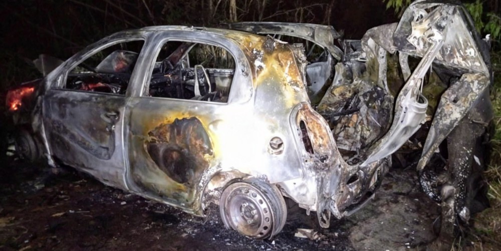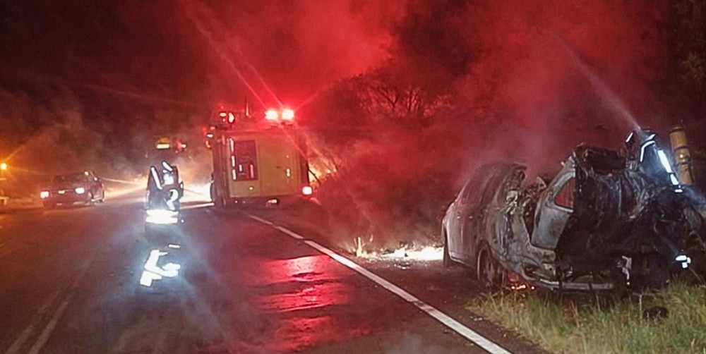 El fuerte impacto provocó la muerte instantánea del animal y desató un incendio que consumió completamente el vehículo. Bomberos Voluntarios acudieron al lugar y lograron extinguir las llamas, mientras asistían al conductor, quien sufrió un traumatismo ocular derecho, un hematoma en la región frontal y varias heridas cortantes.