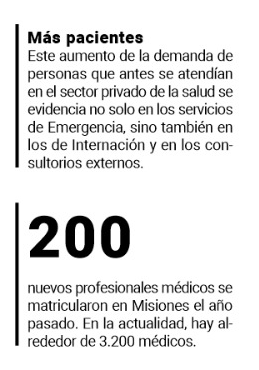 Según la médica, que está a cargo de la dirección del Hospital de Fátima (Garupá) hace ya varios años, “esta demanda de los afiliados de obras sociales hacia el hospital creció fácilmente de uno a tres (se triplicó) y por supuesto que a veces no damos abasto por lo que tratamos de pedir colaboración a los sanatorios e instituciones privados. Los llamamos cuando tenemos un paciente con ciertas características, que requiere muchos días de internación, y les pedimos que colaboren con la cama, con un lugar para poder asistirlo y de ese modo podemos dejar el hospital esté disponible para los que no tengan cobertura de obra social”.