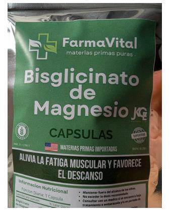 Estas últimas se conocen en el mercado como Bisglicinato de magnesio, de la marca Farma Vital, materias primas puras, que entre sus supuestas bondades señala que “alivia la fatiga muscular y favorece el descanso” y que se promociona como “Gluten Free y Superfood”.