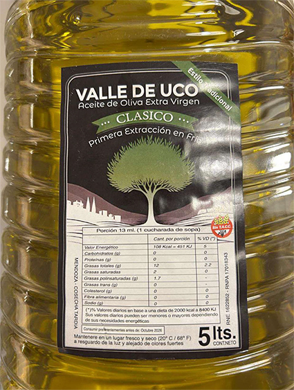 La ANMAT prohibió también la elaboración, fraccionamiento y comercialización “en todo el territorio nacional y en plataformas de venta en línea” del aceite de oliva extra virgen clásico Valle de Uco – Cosecha Tardía, “en todas sus presentaciones, lotes y fechas de vencimiento”.