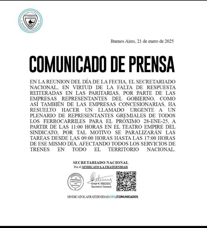 “En la reunión del día de la fecha, el Secretariado Nacional, en virtud de la falta de respuesta reiteradas en las paritarias por parte de las empresas, representantes del Gobierno y también las empresas concesionarias, ha resuelto hacer un llamado urgente a un plenario de representantes gremiales de todos los ferrocarriles para el próximo 28 de enero, a partir de las 11 en el teatro Empire del sindicato”, indicó La Fraternidad en un comunicado.