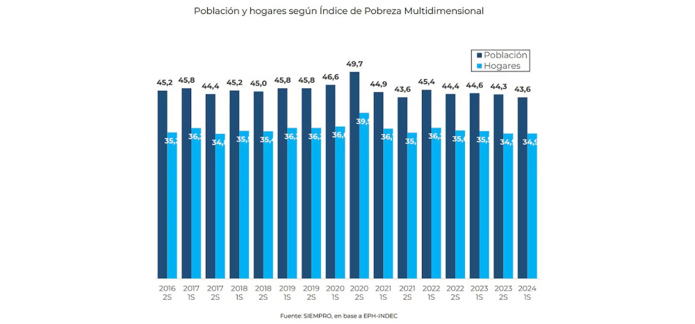 El Gobierno también cruzó datos de pobreza multidimensional con ingresos tradicionales para ofrecer una visión más completa. Según este análisis, el 61% de la población es considerada pobre bajo este criterio en 2024, un aumento respecto al 55,4% del segundo semestre de 2023. Esto indica un agravamiento en la situación económica.