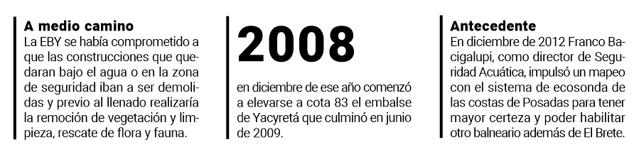 Es común observar en distintos puntos de la costa del Paraná en Posadas como asoman algunos troncos de árboles que fueron cortados como parte del trabajo de tratamiento costero que no se completó con el retiro definitivo de los mismos, al igual que a orillas del arroyo Garupá, solo por nombrar algunos puntos más conocidos, tareas que la EBY no las terminó de completar antes de elevar la cota a 83.