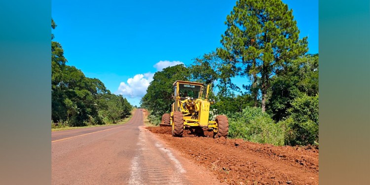 En esta localidad equipos de la DPV trabajan en el mantenimiento de las banquinas de la Ruta Provincial N° 13; el equipo avanza hacia El Soberbio.