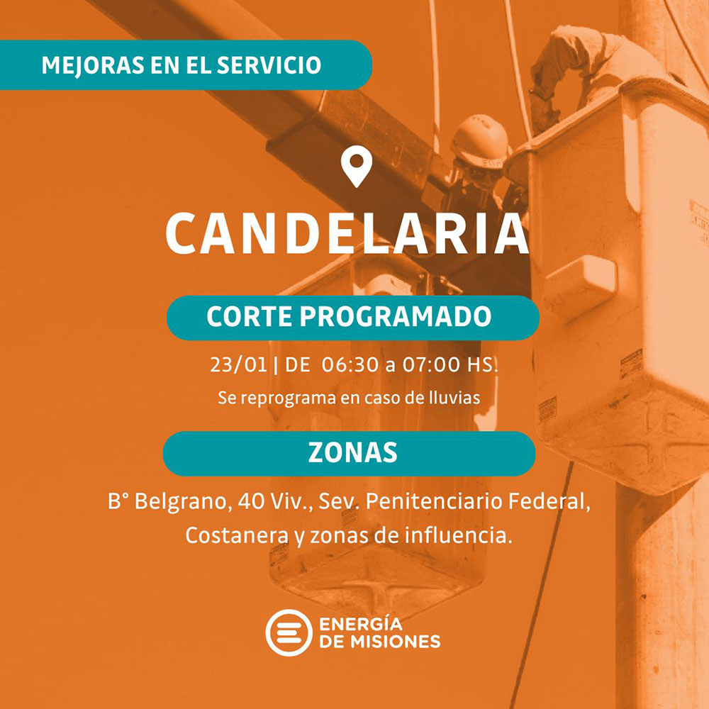 Energía de Misiones SA (EMSA) informó que por mejoras en el servicio durante la jornada de este jueves 23 de enero se realizaran distintos cortes en el suministro de energía eléctrica.