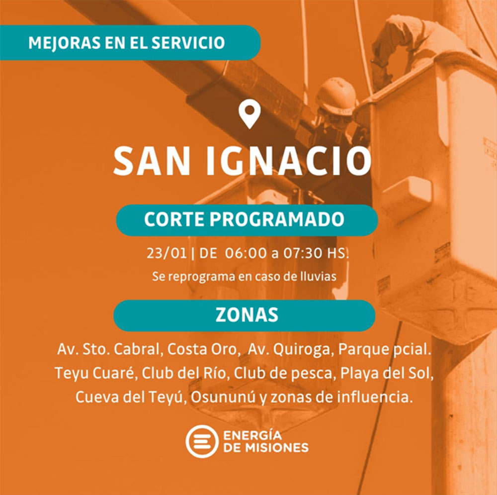 Por último, en San Ignacio estarán sin servicio la avenida Sargento Cabral, Costa Oro, avenida Quiroga, Parque Provincial Teyú Cuaré, Club del Río, Club de Pesca, Playa del Sol, Cueva del Teyú, Osununú y zonas de influencia.