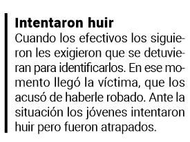 Los sospechosos hicieron caso y cuando se aprestaban a solicitarles identificaciones y documentación del motovehículo, llegó presurosamente un joven que alegó haber sido robado por ellos. El dúo salió a correr para intentar escapar de lo que sería su inminente detención, pero fueron alcanzados y reducidos.