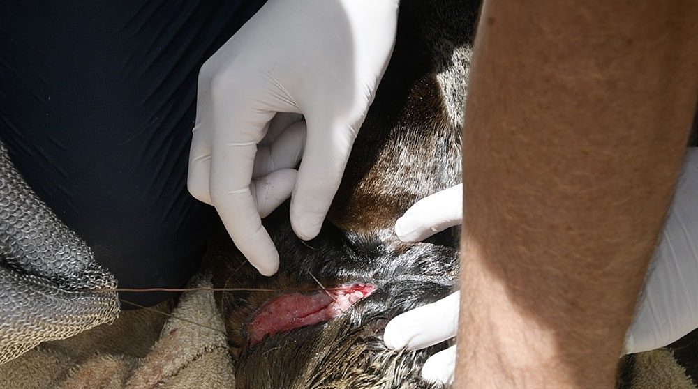 El equipo de rescate de Mundo Marino llegó rápidamente al lugar, asistió al animal y lo trasladó al centro. Allí, los veterinarios detectaron una herida profunda que había cortado fragmentos de músculo en el cuello y el hombro derecho. Según Juana Caferri, médica veterinaria de la fundación, se realizó un tratamiento sistémico con antibióticos, analgésicos y limpiezas locales para acelerar la cicatrización.