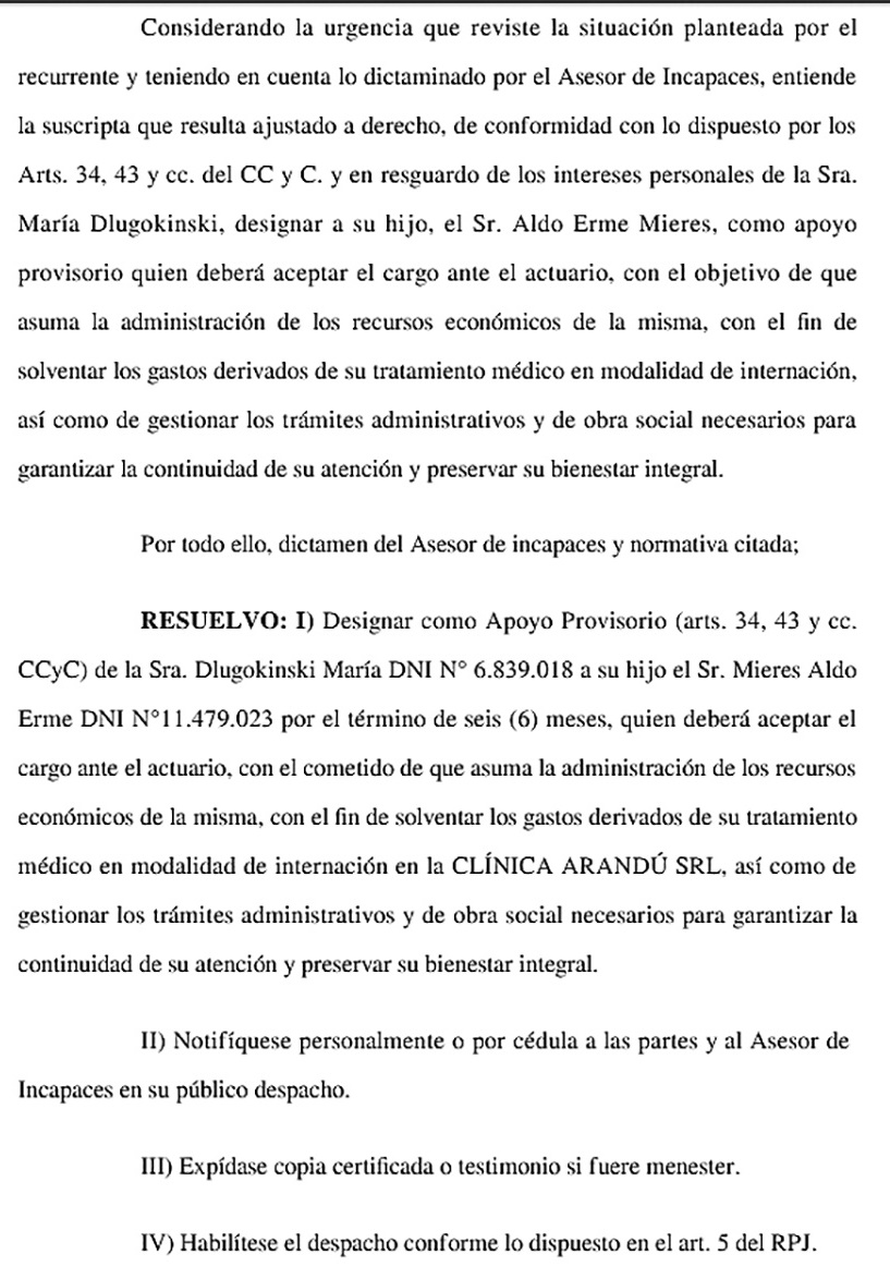 El 27 de diciembre, la jueza del Juzgado de Familia N° 3, Elisa Beth Kiczka, designó como apoyo provisorio de la mujer de 94 años a su único hijo, Aldo Mieres, “por el término de seis meses, quien deberá aceptar el cargo ante el actuario, con el cometido de que asuma la administración de los recursos económicos de la misma, con el fin de solventar los gastos derivados de su tratamiento médico en modalidad de internación en la Clínica Arandú, así como de gestionar los trámites administrativos y de obra social necesarios para garantizar la continuidad de su atención y preservar su bienestar integral”. El pedido de determinación de capacidad de su mamá fue presentado en noviembre de ese año.