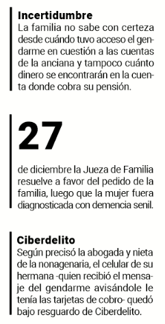 “Lo más alarmante es que mi abuela hizo entrega de sus tarjetas de cobro, tanto de la jubilación como de la pensión, al gendarme que luego denunciamos ante la Justicia. Mi abuela es pensionada de Gendarmería Nacional y, según pudimos averiguar después a través de testimonios de los vecinos, este gendarme entraba y salía del domicilio de mi abuela siempre con cosas y también cobraba su sueldo por ella”.