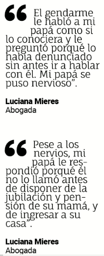 El lunes, cuando la abogada se presenta con su papá, la persona a cargo de la certificación de la carta poder era el mismísimo gendarme denunciado ante la Justicia por la familia, a quien reconocieron por su firma puesto que no lo conocían personalmente. “Por supuesto que ya estaban al tanto de las actuaciones en su contra ante la Justicia porque el viernes yo había dejado fotocopias de los papeles y, cuando lo vio a mi papá lo abordó como si lo conociera, ‘¿Por qué me denunciaste, Aldo? Antes, hubieran venido a hablar conmigo’. Mi papá, un hombre de 70 años que sufre de presión alta, se puso muy nervioso y le respondió por qué él no lo llamó antes de disponer de la jubilación y pensión de su mamá. Le pedí que me dejara a mí responder. Le dije que la denuncia fue por sugerencia mía porque lo sucedido es muy grave. Después de eso, me entregó la carta poder certificada, sellada y firmada por él”, recordó.