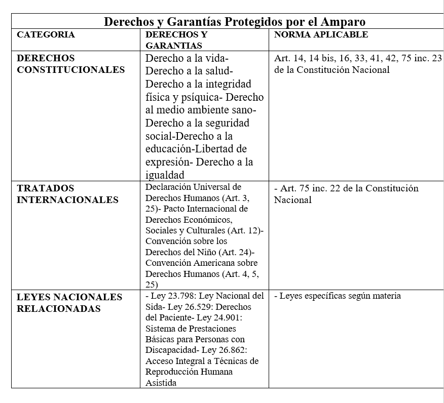 El amparo es un proceso judicial simplificado, rápido y efectivo para proteger derechos garantizados de manera explícita o implícita por la Constitución Nacional, los tratados internacionales y leyes específicas vulnerados o amenazados, de manera urgente.