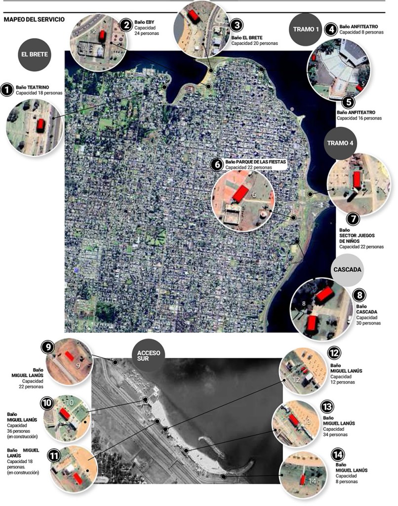 • Miguel Lanús: en el Complejo Costa Sur funcionan cuatro núcleos sanitarios. En el excamping (con capacidad para 22 personas). Luego existen dos en la zona gastronómica con capacidad para 12 personas y otro para 34 personas (el más grande en funcionamiento hasta ahora).