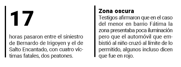 Un niño de 5 años fue atropellado en el acceso al barrio Fátima cuando trasponía la ruta con sus abuelos. Un peatón de 33 años en San Pedro, un motociclista de 17 años en Salto Encantado y un automovilista en Bernardo de Irigoyen las otras víctimas.