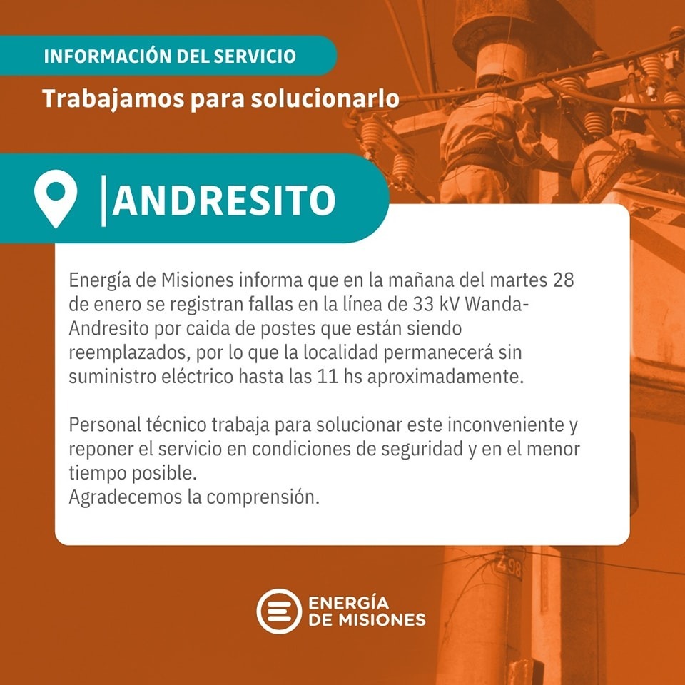 Energía de Misiones SA (EMSA) informó que, durante la mañana del martes 28 de enero, se registraron fallas en la línea de 33 kV Wanda-Andresito debido a la caída de postes. Este incidente dejó sin suministro eléctrico a la localidad de Andresito, situación que se espera normalizar hacia las 11 de la mañana.