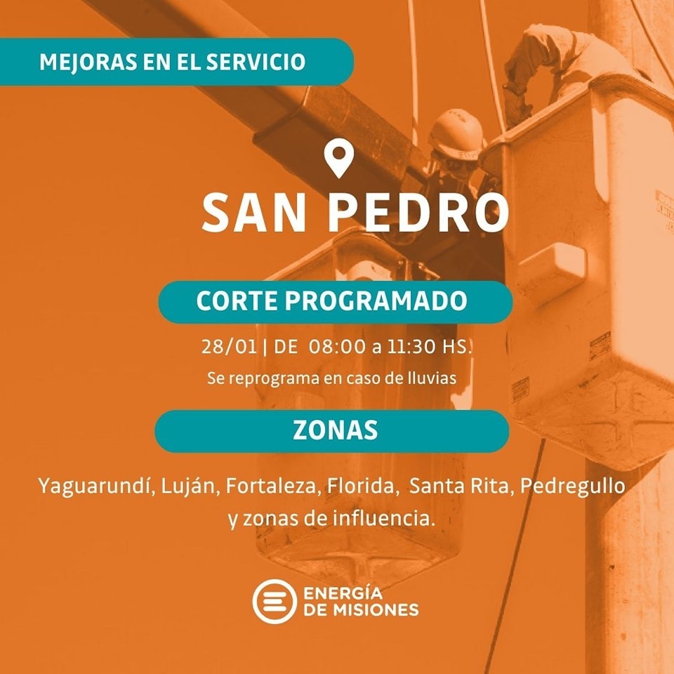 Además se recuerda a los residentes de los siguientes barrios de San Pedro: Yaguarundí, Luján Fortaleza, Florida, Santa Rita, Pedregullo y zonas de influencia que el corte programado por mejoras en el servicio que comenzó a las 8 horas continuará hasta las 11.30.