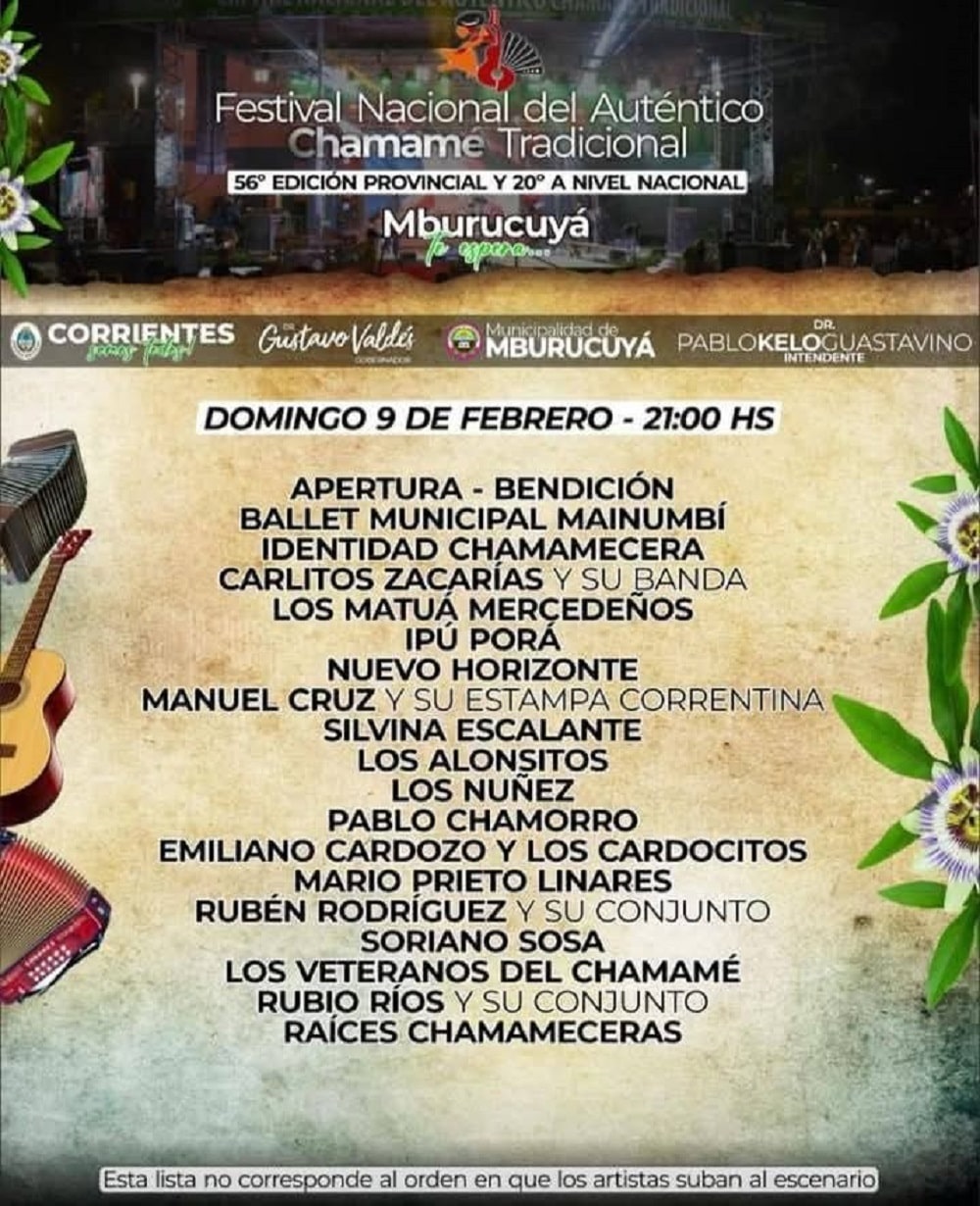La localidad correntina de Mburucuyá se volverá a vestir de gala para recibir a una nueva edición del Festival Nacional del Chamamé tradicional, que se llevará a cabo del 7 al 9 de febrero en el anfiteatro Eustaqui Miño.