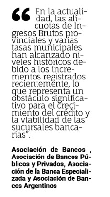 En el documento, firmado por la Asociación de Bancos (ABA), la Asociación de Bancos Públicos y Privados (ABAPPRA), la Asociación de la Banca Especializada (ABE) y la Asociación de Bancos Argentinos (ADEBA), se destacó que “la elevada carga de impuestos distorsivos que afecta a la actividad financiera es uno de los factores que explican, pese al crecimiento registrado en el último año, el bajo y decreciente nivel de préstamos en relación al PBI en los últimos 25 años”.