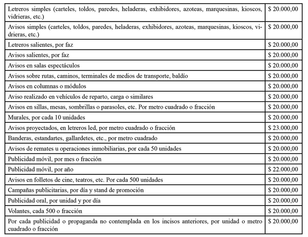 Entre los principales cambios, se establece que la tasa por publicidad en la vía pública o dentro de locales con acceso al público será de $20.000 por metro cuadrado anual. En caso de anuncios iluminados, el monto se duplicará, y si incluyen animaciones, se incrementará en un 20%.