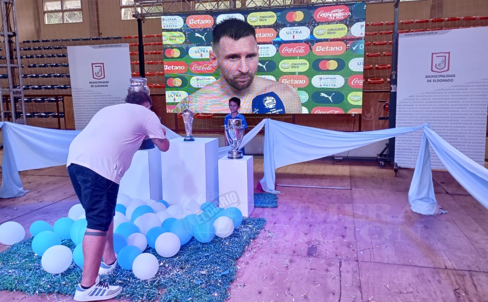 La gira de las copas ganadas por la Selección Argentina en la tierra colorada se inició el viernes en el Polideportivo Ian Barney II de Oberá. Pero, este sábado la muestra ya comenzó en el Polideportivo del kilómetro 3 de Eldorado, que desde muy temprano abrió sus puertas para recibir a los cientos de fanáticos que se acercaron a conocer de cerca los trofeos que levantó Lionel Messi y todos los integrantes de La Scaloneta.