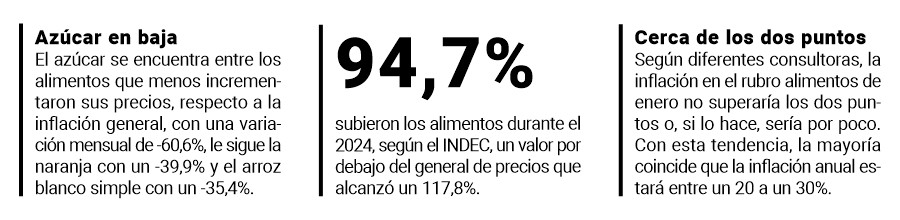 La inflación en el rubro de los alimentos tuvo un incremento del 94,7% en 2024, por debajo del nivel general de precios, el cual alcanzó el 117,8%, de acuerdo al Instituto Nacional de Estadística y Censos (INDEC). En diciembre pasado, alimentos subieron 2,2%, también menos que la inflación de ese mes (2,7%).